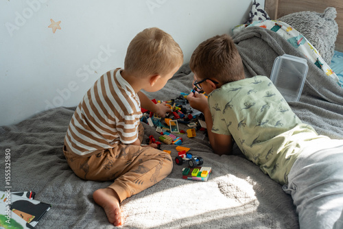 Naklejka premium Two little boys playing with colorful plastic building blocks on cozy bed in sunlit kids bedroom. Concept of childhood creativity, family bonding, indoor play and educational toys.