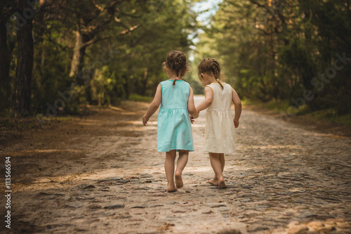 © superelaks, Fototapeta premium Two little girls on a forest road