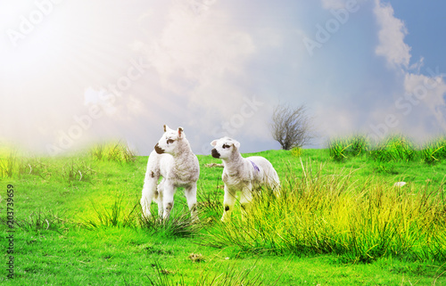 Fototapeta premium two little lambs on the fields with blue sky backgrounds