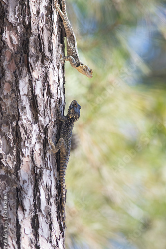 Obraz premium Two lizards face to face on the pine tree - agama lizard sits in Turkey -...