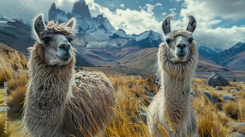 © GradPlanet, Obraz premium two llamas standing in a field with mountains in the background