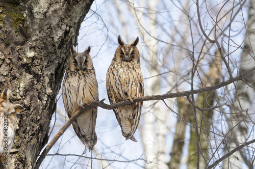 © Victor Tyakht, Obraz premium Two Long-eared Owls in spring in birch forest