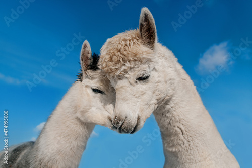 © Rita Kochmarjova, Fototapeta premium Two lovely alpacas on the background of blue sky. South American camelid.