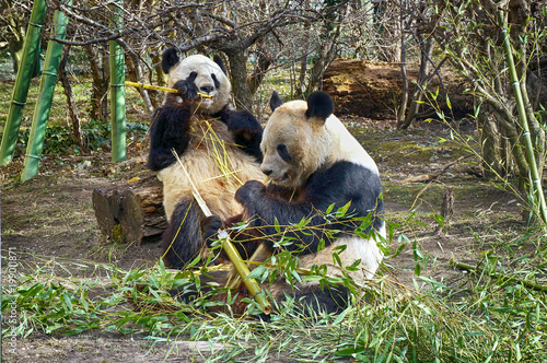 © Oleg1824f, Obraz premium two lovely giant panda bear eating bamboo