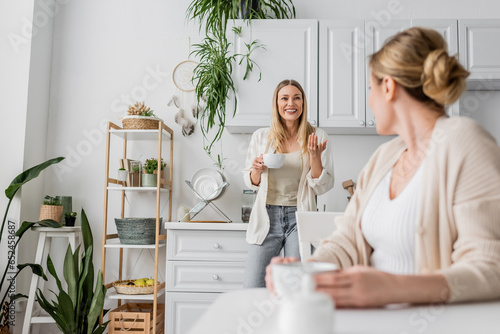 Fototapeta premium two lovely sisters in casual wear talking and smiling on kitchen backdrop, quality time, bonding