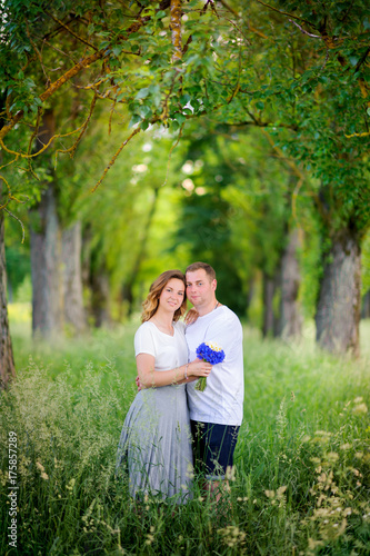 Fototapeta premium two lovers walk in the park at sunset, tenderly and dream