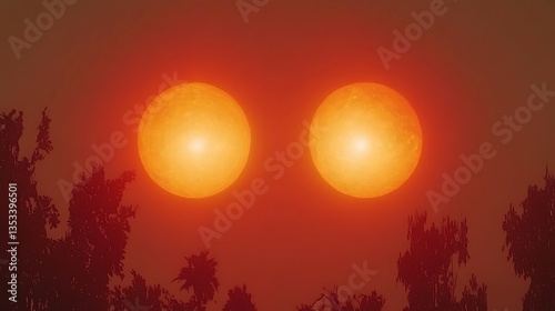 © Andra, Obraz premium Two luminous celestial bodies shine above tree silhouettes at dusk