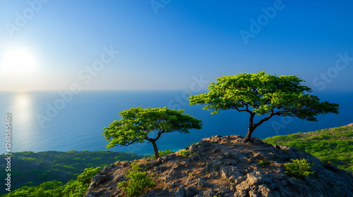 © Arthur Constantine, Obraz premium Two Lush Green Trees on Rocky Cliff Overlooking Calm Ocean at Sunset