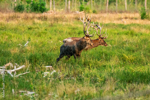 © zorandim75, Fototapeta premium Two majestic deer standing in lush green meadow view