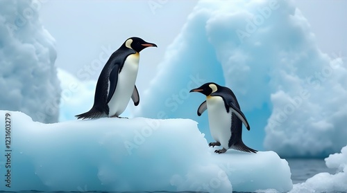 Naklejka premium Two Majestic Emperor Penguins on Icebergs in Antarctica Stunning Wildlife...