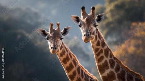 © netsay, Fototapeta premium Two Majestic Giraffes Standing Side by Side in a Serene Woodland, Perfect for NatureFocused Projects Inspires Tranquility and Awe.