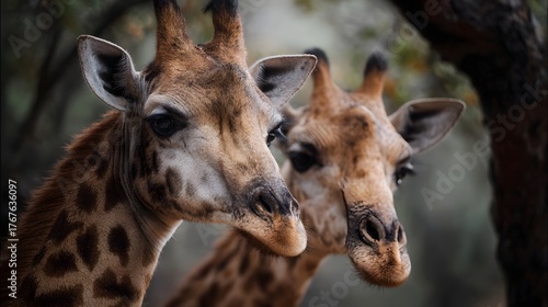 Obraz premium Two majestic giraffes with distinctive patterned fur are close up against a blurred natural background