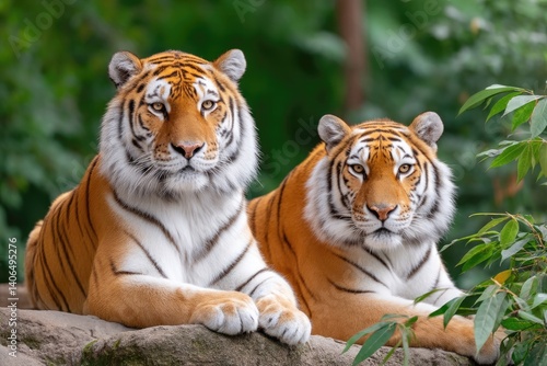 Naklejka premium Two majestic Siberian tigers rest side-by-side on a rock.