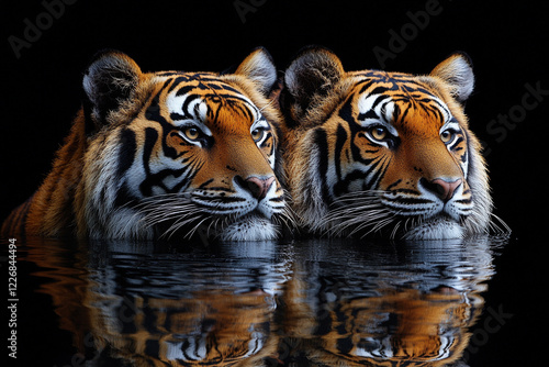 © Myartsam Design, Naklejka premium Two Majestic Tigers Gaze Serenely Over Water