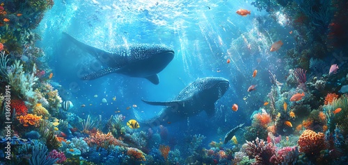 Fototapeta premium Two majestic whale sharks gracefully swim above a vibrant coral reef teeming...