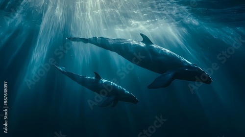 Fototapeta premium Two majestic whales swimming gracefully in deep blue waters.