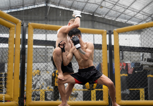 © Nassorn, Fototapeta premium Two male athlete boxing competition in ring. Diverse ethnic men punch fighting in MMA kickboxing exercise in fitness gym. Boxing is fighter sport training need body strength and power fist to knockout