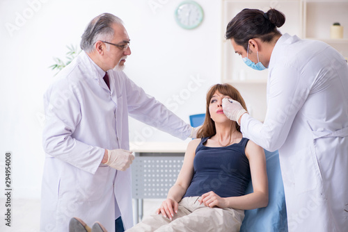 Fototapeta premium Two male doctors and young woman in plastic surgery concept