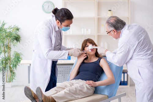 Obraz premium Two male doctors and young woman in plastic surgery concept