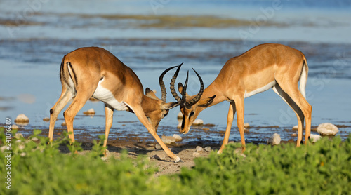 Fototapeta premium Two male impala antelopes (Aepyceros melampus) fighting, Etosha National...