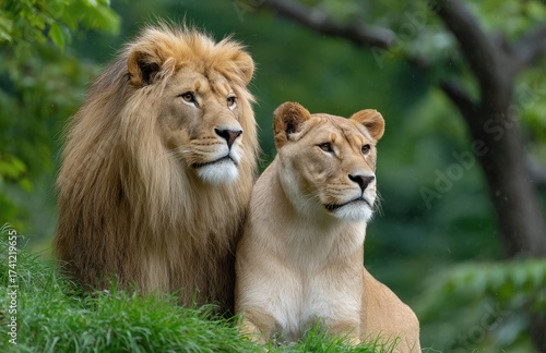 © thiquynh, Obraz premium two male lions in green grass, one standing and the other lying down.