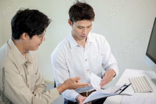 © Kittipong, Obraz premium Two male office workers are discussing work in the office.