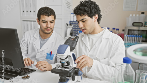Fototapeta premium Two male scientists working together in a laboratory, using a microscope and computer for research.