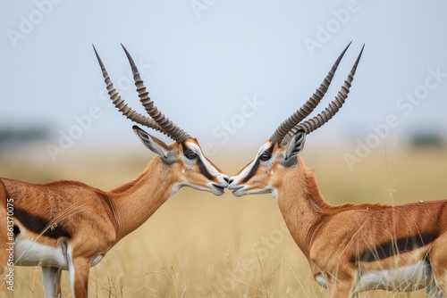 © Straxer, Fototapeta premium Two male Thomson's Gazelles are preparing to lock horns in the Maasai Mara savanna.