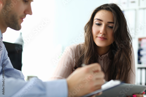© H_Ko, Obraz premium Two managers communicate in office while studying business documents