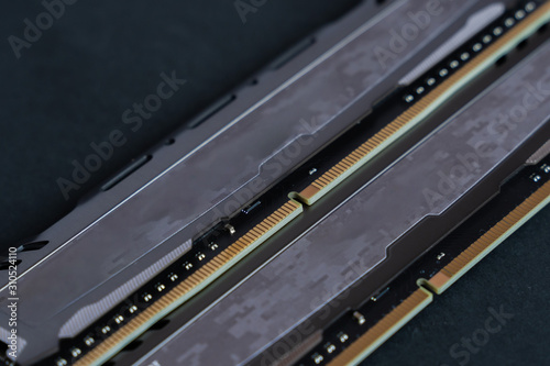 Obraz premium Two memory modules. Fast DDR4 RAM. Gamer DRAM sticks. PC gaming components.