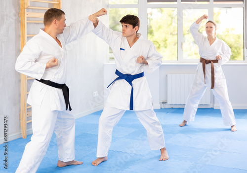 Naklejka premium Two men are trained to perform basic defensive karate installations and attacking actions for combat techniques classes. Coach comments and corrects mistakes of students