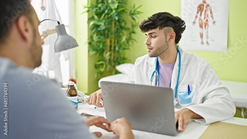 Obraz premium Two men doctor and patient using laptop having consultation at clinic