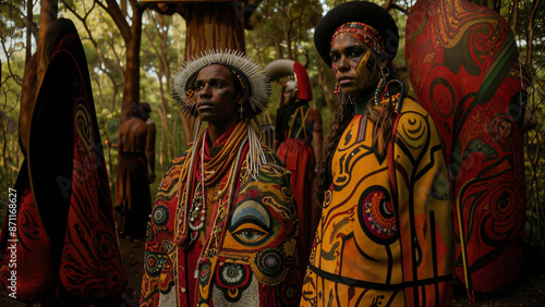© Vanmeter28, Naklejka premium two men in colorful costumes stand in a forest with trees