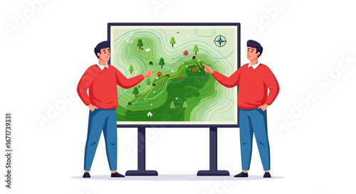 © arozzmer, Fototapeta premium Two men in red shirts and blue pants pointing at a topographic map on a stand