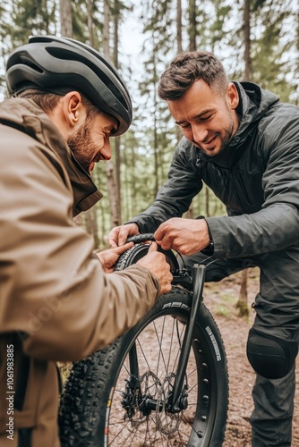 © sori, Fototapeta premium Two men repairing a bicycle tire in a forest setting.