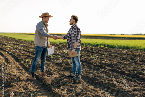 © cherryandbees, Fototapeta premium Two men shake hands on the field. Buying property.