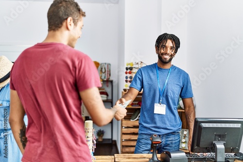 Obraz premium Two men shopkeeper and customer paying purchase with dollars at clothing store