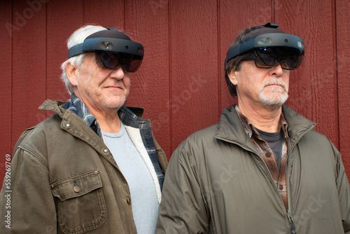 Fototapeta premium Two men wearing virtual reality goggles, outdoors.