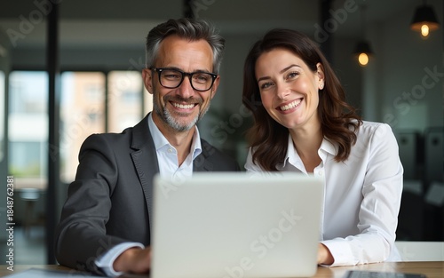 © William, Fototapeta premium Two middle age business workers smiling happy and confident. Working together with smile on face using laptop at the office. High quality