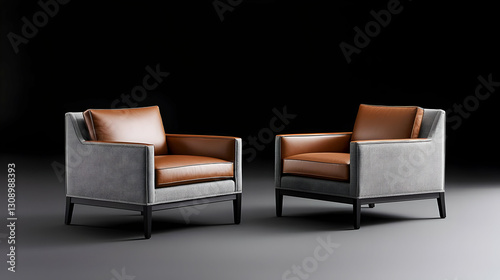 © Eko, Fototapeta premium Two Modern Armchairs with Brown Leather Seats and Textured Gray Sides on Dark Background