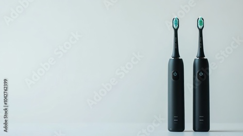 © wikkie, Fototapeta premium Two modern electric toothbrushes displayed on a minimalistic background.