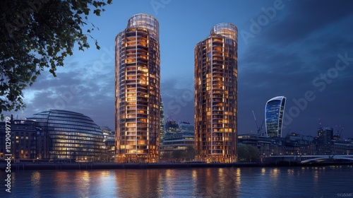 Naklejka premium Two modern, illuminated skyscrapers stand tall by a river at dusk, with other...