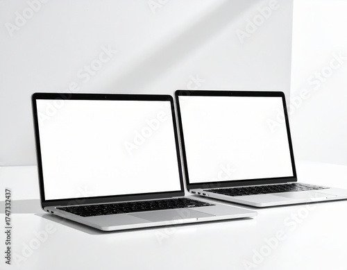 © Carmi, Fototapeta premium Two Modern Laptops with Blank Screens on White Surface in Studio Lighting