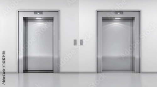 © Gajah, Naklejka premium Two modern stainless steel elevators in a white hallway.