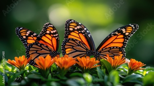 © RONNY, Fototapeta premium Two monarch butterflies on orange flowers.