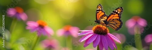 Fototapeta premium Two monarch butterflies on vibrant purple coneflowers, sunlight dappled , insect, natural