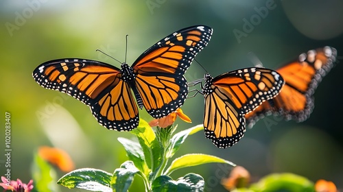 Naklejka premium Two Monarch butterflies perched on vibrant flowers in a sunny garden.