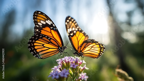 © toufik, Naklejka premium Two monarch butterflies resting on a purple flower in soft sunlight