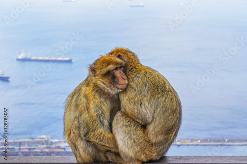 Naklejka premium Two monkeys hug, Strait of Gibraltar, Spain. With selective focus.