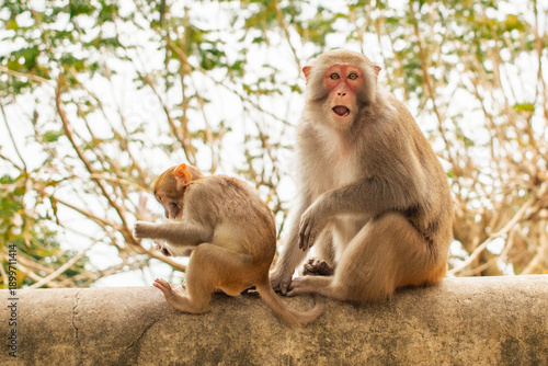 © Vasilisa Dorofeeva, Obraz premium two monkeys sitting together, larger one looking surprised with open mouth, smaller beside it
